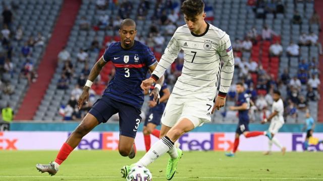 整个比赛的内容和形势,与2018年世界杯首战0比1负于墨西哥时如出一辙,安联球场的幸运光环也没有加持到德国队身上。对阵法国队,勒夫摆出了343的阵型,首发的球员与对阵拉脱维亚一样:基米希和戈森斯分别在两个边路,京多安与克罗斯坐镇中路,哈弗茨、格纳布里与穆勒搭档锋线。全队首发年龄达到28岁347天,世界大赛上德国队首发年龄高于本次首发的只有一次——2000年欧洲杯对阵罗马尼亚。巧合的是,德国队的未来主帅弗里克也出现在比赛现场。
